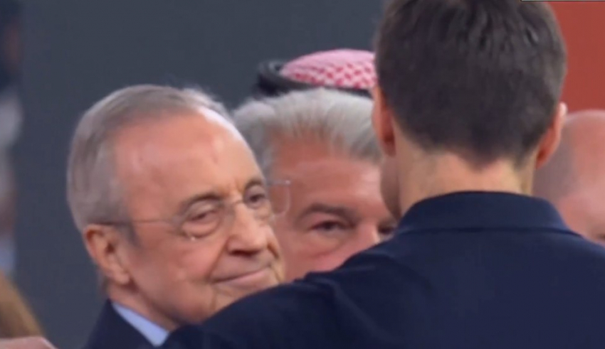 Hilsenen mellem Florentino Pérez og Xabi Alonso efter Supercup-nederlaget. Florentinos ansigt sagde det hele.