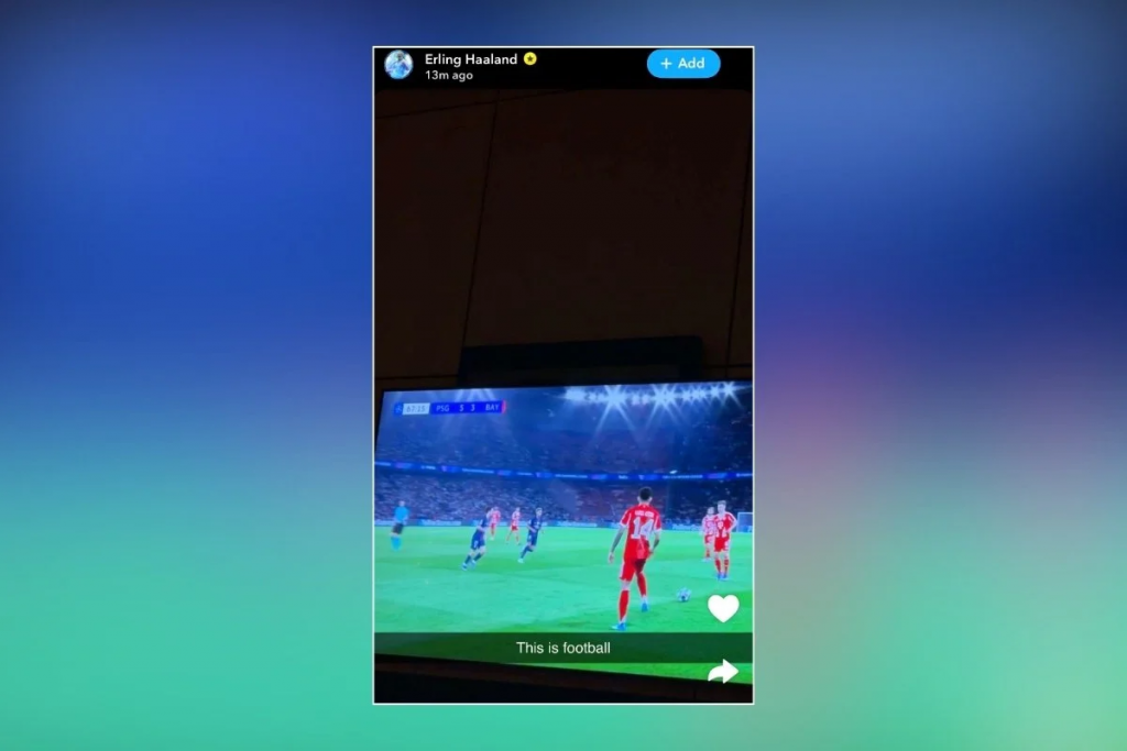 Midt i kampens hede, greb Haaland sin telefon og brugte Snapchat til at fange et screenshot fra kampen. Med få ord og en solid fodboldånd skrev han: “Det her, det er fodbold”.